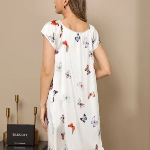 Details: Crafted from pure mulberry silk, this short nightgown features a fluid loose fit paired with a graceful square neckline and delicate cap sleeves. The soft butterfly motif brings a sense of lightness and individuality, while the smooth, breathable silk glides gently over the skin. Balanced between comfort and elegance, it’s a charming choice for serene nights or relaxed lounging with a poetic touch.