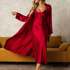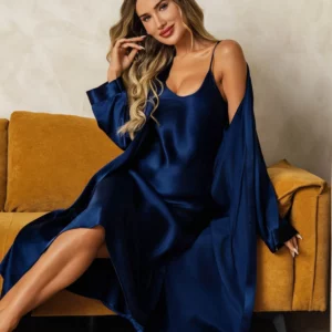 100% mulberry Silk charmeuse V-Neck Midi Nightgown & Robe Set 2Pcs