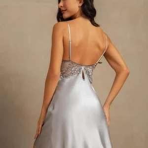 100% mulberry Silk Spaghetti Strap Mini Nightgown with Lace Backless V-neck Design