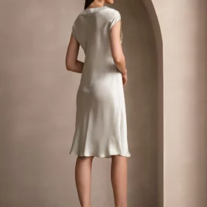 Made from 100% mulberry silk with no harmful substances, this knee-length nightdress doubles as a lounge dress. Straight fit, V-neckline, and cap sleeves offer smooth drape, breathable comfort, and effortless elegance.