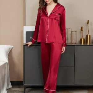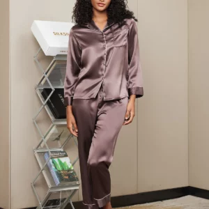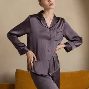 Description: This long-sleeve silk pajama set is crafted from pure mulberry silk and designed for effortless comfort. The button-front top with a notched collar and pocket pairs seamlessly with full-length pants that allow free movement. Finished with refined piping details, it brings together everyday ease and understated luxury.