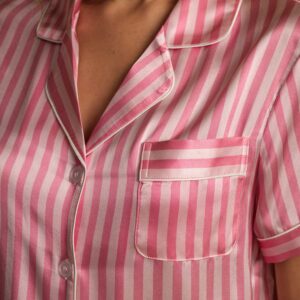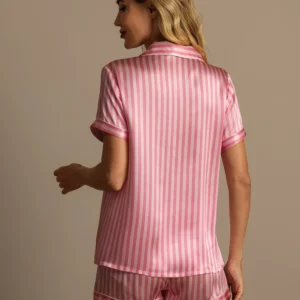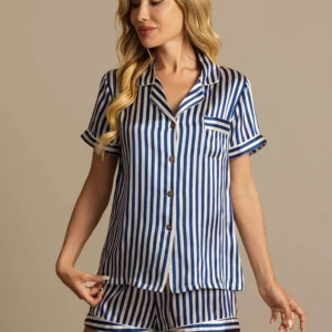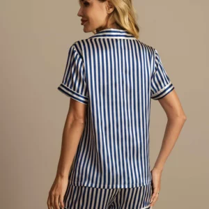 Details: Made from pure mulberry silk, this pajama set combines a short-sleeve button-front shirt with matching shorts featuring an elastic waist and drawstring. The smooth, breathable silk drapes beautifully, while the striped pattern brings a refined, understated elegance. An ideal choice for comfortable sleep or relaxed lounging.