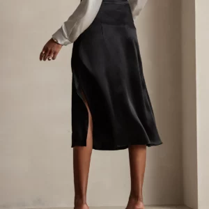 Details: Crafted from smooth, flowing silk satin stretch fabric, this long A-line skirt features a clean side zip and a discreet side slit. The lustrous finish highlights its timeless silhouette, making it a versatile choice for both sophisticated daywear and elevated evening ensembles.
