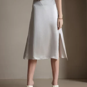Made from 19 momme mulberry silk with stretch, this long A-line skirt features a side zipper and subtle slit hem. Smooth, flowing, and elegantly lustrous, it creates a graceful feminine silhouette perfect for day or evening wear.