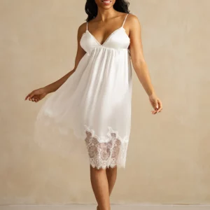 Details: Crafted from pure mulberry silk, this spaghetti-strap sleep dress features a graceful V-neckline and a finely finished lace hem that elevates its feminine appeal. The fluid drape and breathable texture feel gentle against the skin, making it ideal for both restful sleep and relaxed lounging. Simple yet refined, it’s a timeless addition to an elegant sleepwear wardrobe.