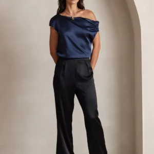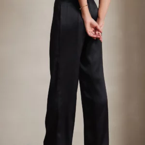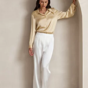 A Luxurious 19 Momme stretch mulberry silk wide-leg pants with a flattering high-waist fit, elegant drape, and subtle sheen—designed for effortless sophistication from day to night.