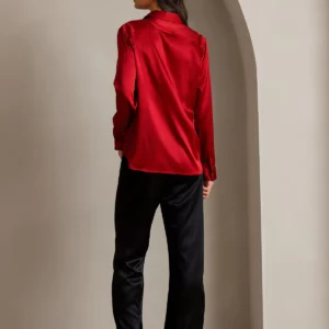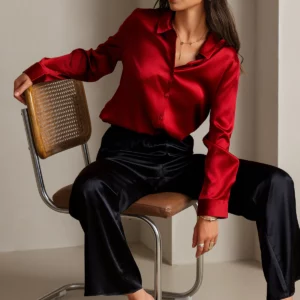 Made from 19 momme mulberry silk with added stretch, this long-sleeve blouse features a regular fit, turn-down collar, and buttoned cuffs. Smooth, refined, and versatile for work or evening wear.