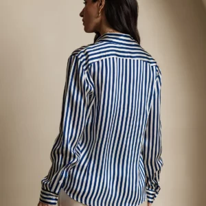 Details: Crafted with a smooth, lustrous surface, this silk blouse features a classic button-front design paired with a sharp, tailored collar. The subtle stretch enhances comfort and movement, making it an elegant choice for both professional wear and evening occasions.