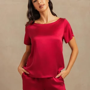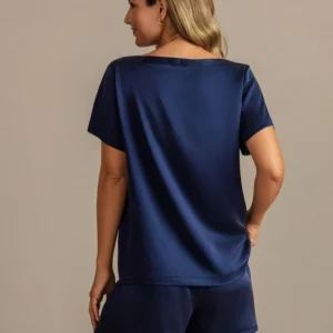 Made from a 95% mulberry silk and 5% spandex blend, this short-sleeve and shorts set offers breathable comfort with a flexible, flattering fit. Finished with side pockets and a stylish leg slit, it’s designed for effortless lounging and everyday ease.