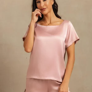 mulberry Silk 19Momme Women’s Short Sleeve Round Collar Pajamas Set with Side Pocket Design
